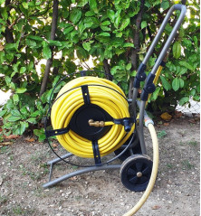 Equipado con 25 metros de manguera tricapa de 15/19 mm de diámetro y que ofrece una presión de trabajo de 8 bares, este carrete está diseñado para un uso intensivo. Su color bronce arenado le confiere un diseño elegante mientras que sus ruedas macizas de 200 mm de diámetro permiten un fácil transporte en su jardín.